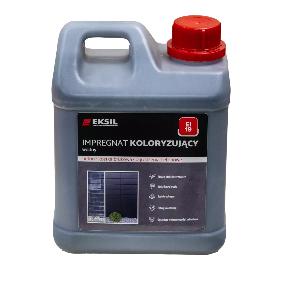 EI 19 to impregnat koloryzujący wodny zabezpieczający podłoże przed działaniem wody oraz słabych kwasów i soli. Podwyższa odporność betonu na ścieranie tworząc polimerową, bezpyłową warstwę ochronną. Impregnat koloryzujący do kostki brukowej, nadaje gruntowanym wyrobom odświeżoną, intensywną barwę.