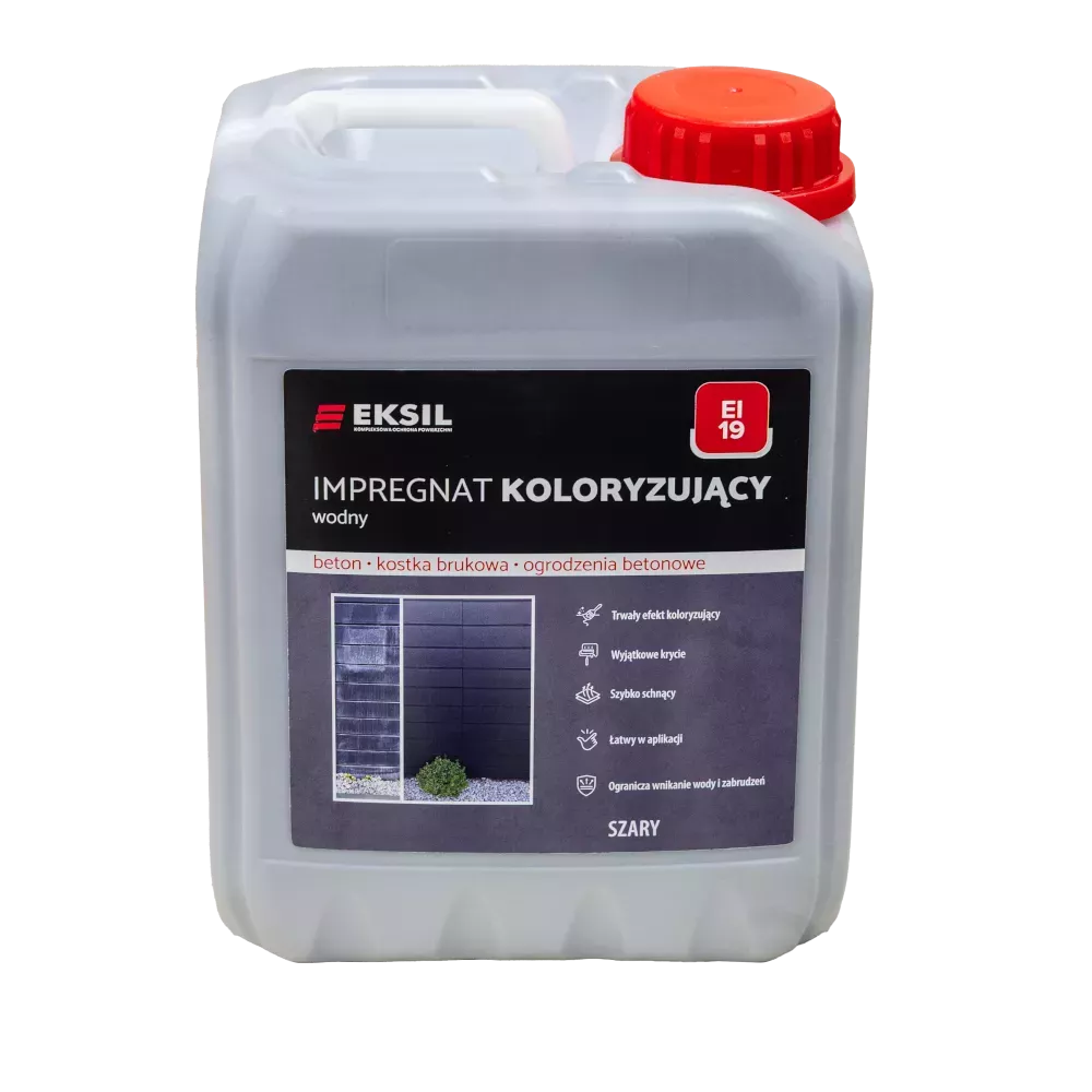 EI 19 to impregnat koloryzujący wodny zabezpieczający podłoże przed działaniem wody oraz słabych kwasów i soli. Podwyższa odporność betonu na ścieranie tworząc polimerową, bezpyłową warstwę ochronną. Impregnat koloryzujący do kostki brukowej, nadaje gruntowanym wyrobom odświeżoną, intensywną barwę.