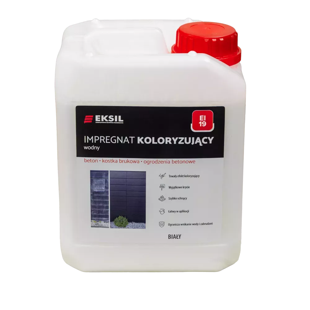 EI 19 to impregnat koloryzujący wodny zabezpieczający podłoże przed działaniem wody oraz słabych kwasów i soli. Podwyższa odporność betonu na ścieranie tworząc polimerową, bezpyłową warstwę ochronną. Impregnat koloryzujący do kostki brukowej, nadaje gruntowanym wyrobom odświeżoną, intensywną barwę.