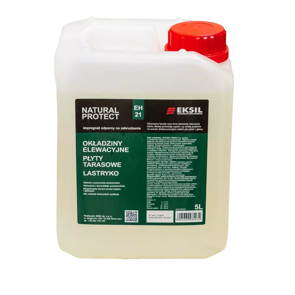 Skuteczna, ekologiczna hydrofobizacja kamienia i materiałów mineralnych. Natural Protect EH-21 to wodny impregnat hydrofobowy przeznaczony do ochrony powierzchni mineralnych — kamienia naturalnego, betonu, cegły czy klinkieru. Preparat penetruje strukturę materiału i tworzy trwałą, niewidoczną barierę ochronną, która zabezpiecza przed wodą, olejami, zabrudzeniami i wykwitami mineralnymi, przy jednoczesnym zachowaniu naturalnego wyglądu powierzchni.