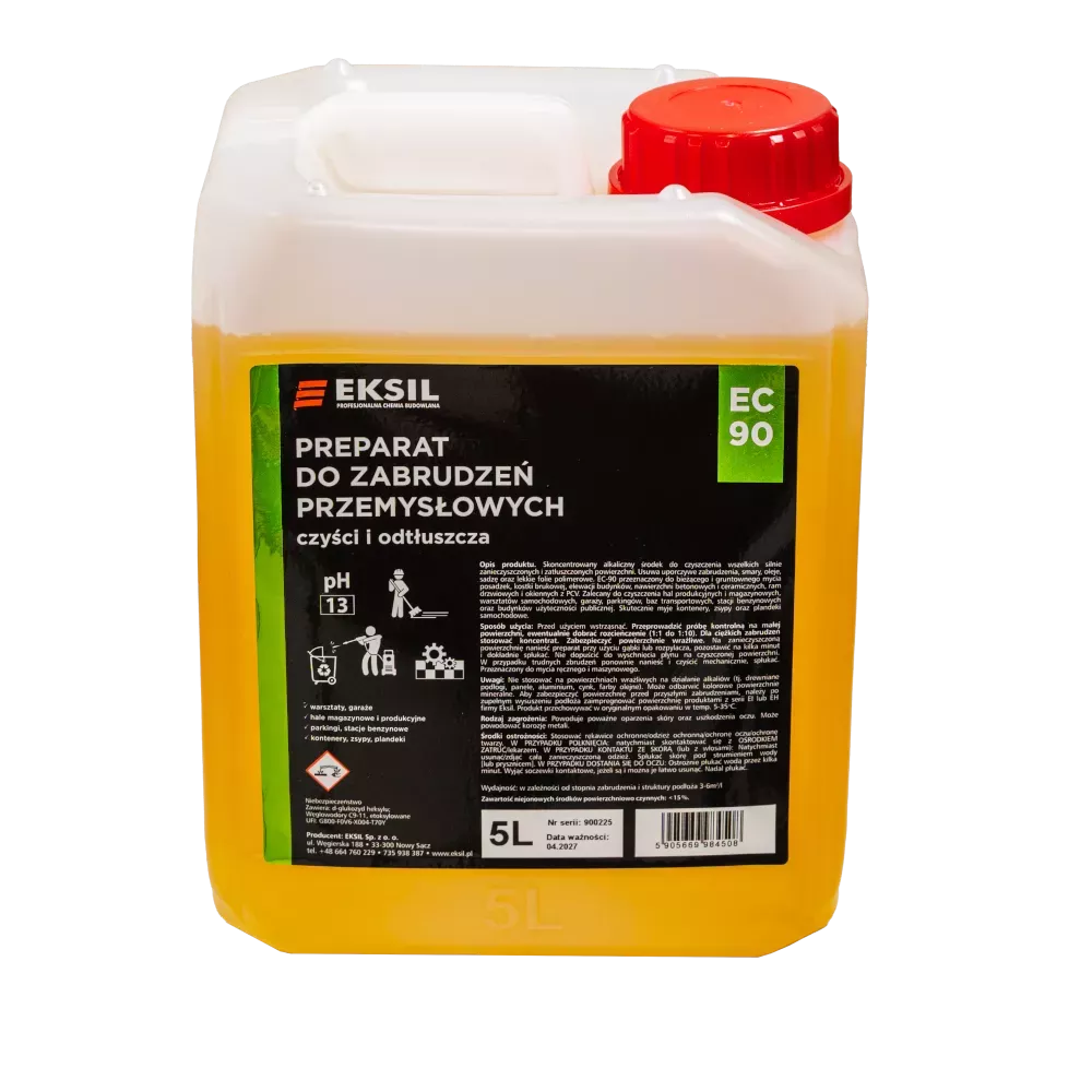 EC 90 jest silnie działający, alkaliczny środek do zabrudzeń przemysłowych. Jest preparatem przeznaczonym do bieżącego i gruntownego czyszczenia hal produkcyjnych i magazynowych, obiektów przemysłowych, warsztatów samochodowych, garaży, parkingów, baz transportowych, stacji benzynowych oraz budynków użyteczności publicznej. Skutecznie myje kontenery, zsypy oraz plandeki samochodowe, elewacje i płyty chodnikowe Produkt bogaty w substancje aktywne, które reagują z oleistymi zanieczyszczeniami, wiążąc je i skutecznie usuwając.