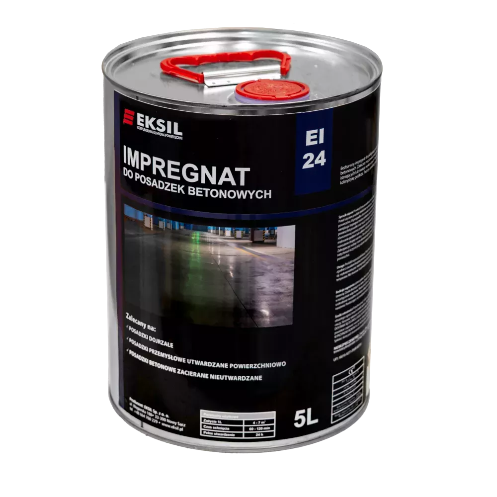 EI 24 bezbarwny impregnat do pielęgnacji, uszczelniania i utwardzania posadzek betonowych. Zalecany na powierzchniach garażowych i przemysłowych już istniejących lub świeżo wykonanych. Nadaje połysk i delikatnie wzmacnia kolorystykę podłoża. Tworzy powłokę trwałą odporną na ścieranie i pylenie.